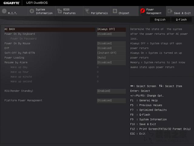 电源管理功能 5、Power management,是电源相关设置选项,我们可以在这里设置平台显示输出的优先级,设置一键唤醒等功能。此外,我们还可以设置定时开机功能,并提供了丰富的节能选项等。 6、我们按下F10即可保存BIOS设置。 篇后语: 以上就是装机之家分享的技嘉主板BIOS设置图解教程,通过以上对技嘉主板BIOS的简单介绍,我们对技嘉BIOS界面以及功能有所了解,希望本文能够帮助到大家。 |