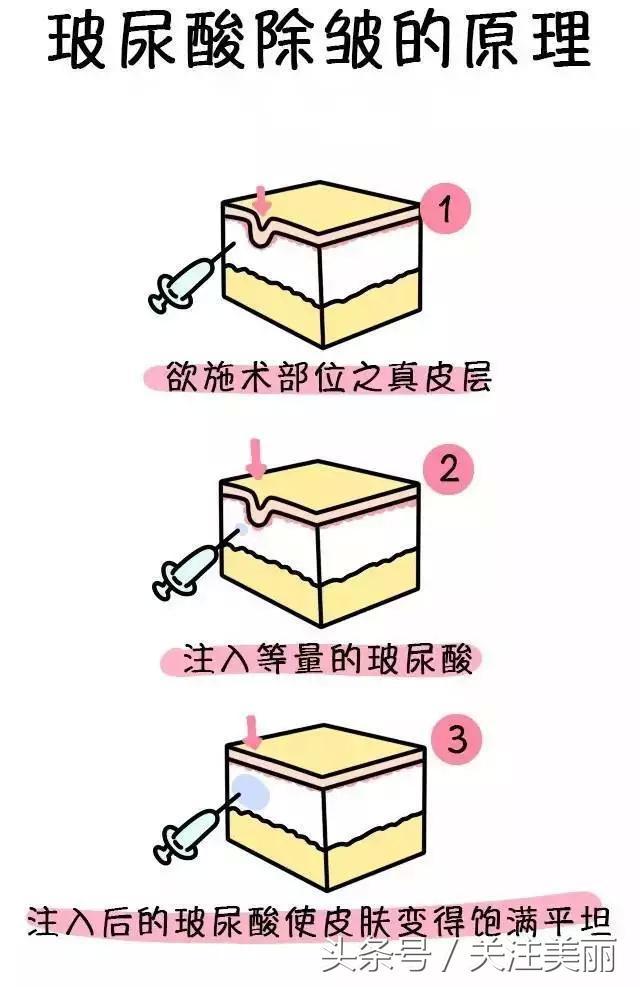 玻尿酸除皱是通过在局部皮下注射玻尿酸针剂,使皱纹抚平,让肌肤保持饱满,重现年轻态。原理图如下: