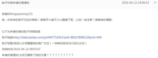 当然,如果你的链接实在敏感,可以把一楼喂给度娘,二楼发布重点内容和广告信息,这样可以提高通过率80%以上。 投诉人工审核 如果按照上面的方法,还是被删除了,那么下面这是绝招了,通过投诉的方式,让他们人工处理审核,如果你的内容是软文,不是硬性广告,90%以上都会被审核通过,小编测试了20篇文章,其中有2篇被机器自动删除了,通过投诉的形式,当天审核通过了。