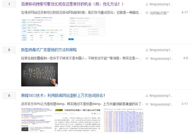 当然,发布的贴吧最好是自己与自己行业相关,但又必须是没有版主的贴吧,如果有版主和管理员,那么就算机器没有删除你的文章,看了你的软文一样会被删除,这里小编建议大家开通一个属于自己的贴吧,比如以自己的品牌命名,或者以自己的名字命名,一来扩大自己的品牌,二来到时候申请版主方便。 总结:贴吧发帖后当天可以上排名,流量上万也就是你一念之间。 |