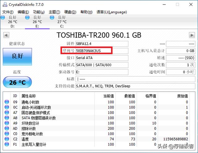 硬盘序列号:终于来一个厉害的 硬盘序列号指的是CrystalDiskInfo中查看到的一串数字/字母混合的代码,他是由硬盘厂商在生产时就固化到固态硬盘当中的。下图所示是东芝TR200 960G固态硬盘的序列号,TR200是原厂SSD中的高性价比热门型号。