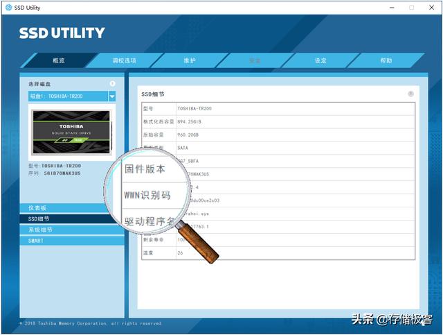 除了序列号之外,比较专业的固态硬盘还会提供一个WWN识别码。WWN是World Wide Name全球统一名称的意思,通常是由权威组织分配的全球唯一的48位或64位编码。并不是所有固态硬盘都会提供WWN识别码,所以这个方法不一定适合作为机器码使用。下图是东芝SSD Utility工具箱软件识别到的TR200 WWN识别码信息。