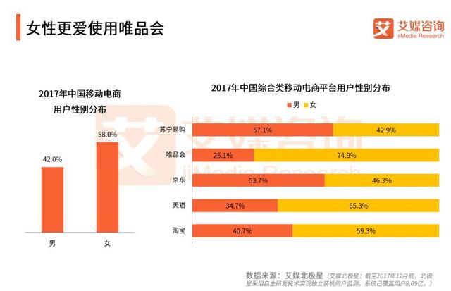 根据艾媒咨询发布的《2017-2018中国移动电商行业研究报告》显示,使用移动电商购物的女性用户偏多,其中唯品会、天猫、淘宝的女性用户都多于男性。