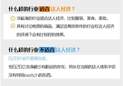 B2B行业不是很合适。因为达人经济里面存在着粉丝,存在着对社会上的一个映射。但B2B它本身极少有粉丝的存在,所以在当前的达人体系中还没有特别match的东西。 九枝兰:有没有通过达人经济建设获得上千万甚至上亿元营收的成功案例? 王传鹏:目前,服装、美食、美妆、文化等行业中的达人经济发展较好。2015年的双11双12,网红的成交量是非常惊人的,据不完全统计,有百分之五十的淘宝流量都是来自于网红。有一个top10的网红叫张大奕,她个人一年有两个亿的营收。