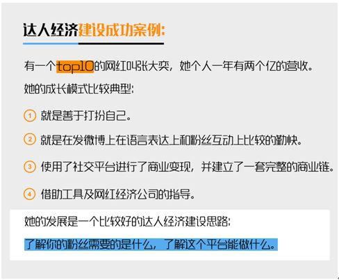 张大奕本身是《瑞丽》的模特,长得漂亮,是个模特,加上微博有自动吸粉的功能,让她有很多的粉丝。她的成长模式比较典型: 第一,就是善于打扮自己。 另外,就是在发微博上在语言表达上和粉丝互动上比较的勤快。 第三,使用了社交平台进行了商业变现,并建立了一套完整的商业链。最早的时候就是发微博,然后忽然间发现其实可以做一些导购的,可以去卖一些相应的商品,后来发现如果把生产链供应链抓在自己的手里那就更加好做了。所以她现在是有一套完整的商业链,不是去卖别人的商品,而是去卖她自己贴牌的商品。 第四,借助工具及网红经济公司的指导。现在都有网红经纪公司专门去做包装,指导她们去怎么做这个工作。并合理的应用平台上的各种工具。之前她会用到微博上的工具九宫格,现在都是发视频,视频的效率更高,基本上能把事情完整地展现出来。 她的发展是一个比较好的达人经济建设思路:了解你的粉丝需要的是什么,了解这个平台能做什么。 九枝兰:一个公司想要参与达人经济,应该具体怎么去落实? 王传鹏:如果一个公司希望做品牌宣传,做一些商业化的新尝试,达人经济是一个比较好的选择。