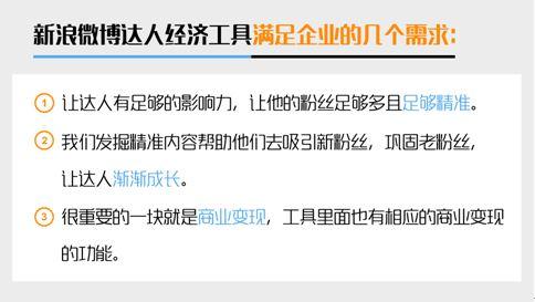 第一,微博的用户特质决定的:年龄层次主要是19岁到24岁,占了50%,这其中60%是女性。这部分人手里有钱,也有时间,也崇尚更加自由更加个性化的东西,会跟随网红,想要过她们这样的生活或者穿这样的衣服。 第二,整个互联网大环境造就了网红。网红不仅在微博上,也盛行于其他社交平台。 第三,达人和达人粉丝一拍即合。达人慢慢意识到自身的价值,并懂得用这些价值变现。而正好普通用户也需要达人的指导,这样就一拍即合。 九枝兰:新浪微博的达人经济工具的产品理念是什么及其具备怎样的优势? 王传鹏:达人经济里面最重要的就是达人,所以我们会根据这些达人的特质进行一些划分,我们也会进行一些大数据的分析,了解这些达人的粉丝群体,定向的经营粉丝。比如,我们会分析出来达人发什么样的内容才可以吸引更多的粉丝。所以新浪微博是在大数据的基础之上开发出达人经济工具,它可以满足企业的几个需求: