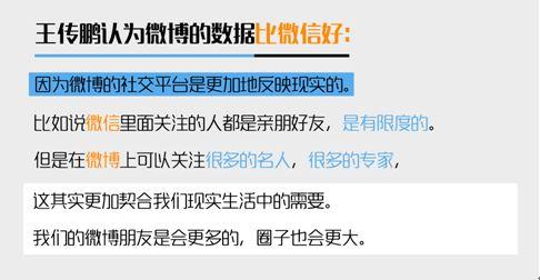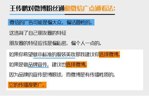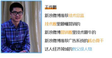 此外,文章最后还有一个彩蛋:在外界看来,新浪微博和微信、粉丝通和广点通之间的关系一直比较微妙,而新浪微博广告的负责人又是如何评价粉丝通和广点通优劣势的? 九枝兰:达人经济对很多人而言,还是比较冷门的行业,你能否给达人经济一个准确的定位? 王传鹏:首先,我们来看看什么是达人?达人的定义非常广,只要是在某一个领域拥有一定专业度的人都可以称之为达人。有可能是个写手、导演、模特。达人经济就是我们通过这一类人实现商业上的变现。
