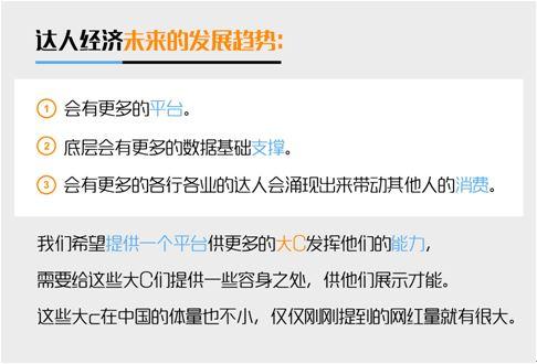 首先,找到与品牌匹配的合适的达人,另外需要配备为达人服务的运营人员。理论上讲,一个人气较旺的网红需要20个人的团队运营。常规工作包括怎么去发微博,怎么把你的产品进行相应的变现,还有就是怎么去接触平台上的这样一些工具。而在前期运转中,2到3个人就是足够的:一个负责达人,另外一个是负责和平台进行沟通,还有一个是负责相应的整合。要想成功的打造一个达人,你对当前的平台需要足够的了解,并掌握足够多的资源。从根源上来讲,达人的微博本身是一个流量入口,卖商品那就是一个商品的入口,卖文字那就是一个文化的入口。把这个入口培养起来需要有专业的人去了解这个大平台:怎么去增长,怎么能发更多的微博让粉丝跟你互动,聚集人气,把这个平台玩起来。 九枝兰:如果企业参与达人经济建设,他应该关注哪些数据? 王传鹏:达人最重要的就是关系。首先要了解的就是企业产品和达人的match程度。另外一个就是达人的粉丝你要足够的了解。这两个数据是值得关注的。如果直接分析小C那是很困难的,因为你要做营销,做用户画像等等。但是如果你有一个大C的存在,会让这个问题简化很多。因为我们天然会作假设,小C是跟着大C走的。大C的数量是有限的,而且是可控的。