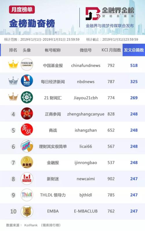 3、金榜勤奋榜 榜单介绍:统计所有财经金融类公众号1月份发文总篇数,由高到低进行排列,榜单选取前10的公众号。ps:在发文篇数相同情况下,按照KCI月指数进行排序。