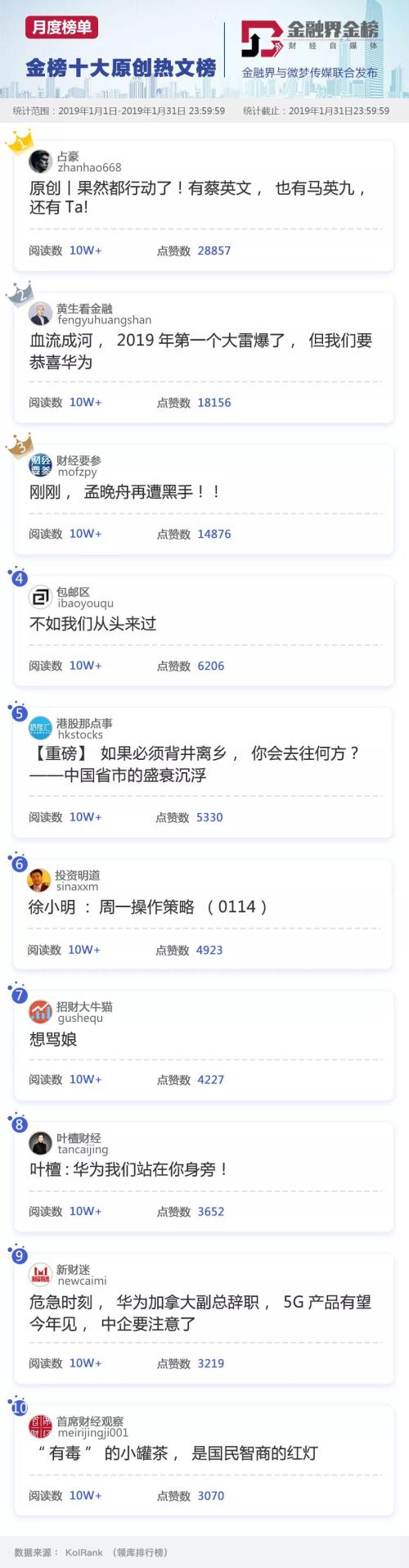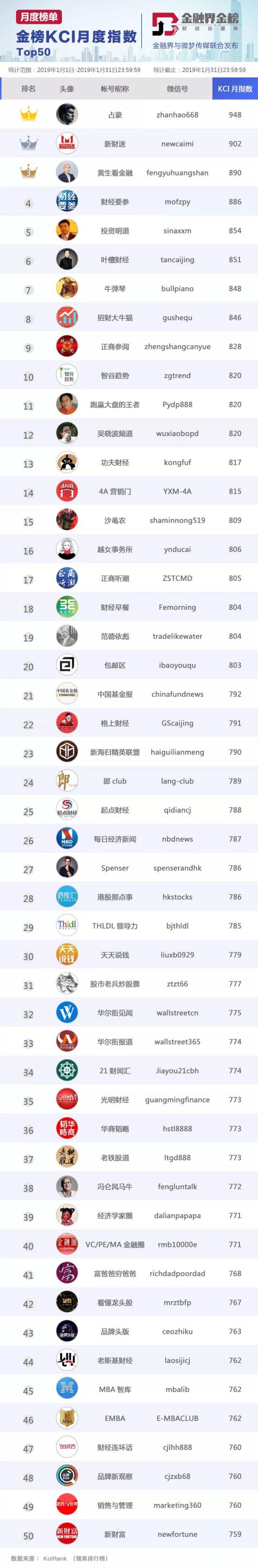 金融界联合微梦传媒,权威发布「金榜」题名—2019年1月份财经金融类公众号影响力报告,旨在用数据洞察金融行业发展态势!以便为广大财经金融类自媒体人及合作伙伴带来参考价值。报告统计时间为2019年1月1日—2019年1月31日。 金融界联合微梦传媒,权威发布「金榜」题名—2019年1月份财经金融类公众号影响力报告,旨在用数据洞察金融行业发展态势!以便为广大财经金融类自媒体人及合作伙伴带来参考价值。报告统计时间为2019年1月1日—2019年1月31日。 注:因相关规则,少部分公众号未纳入榜单统计中。 公众号月度榜单 1、KCI月度指数TOP50 榜单介绍:利用领库平台特有的计算方法,对公众号8项运营数据进行演算,得出评判公众号质量的KCI月指数,指数越高,账号质量越高,榜单选取KCI月指数前50的财经类公众号进行排名。