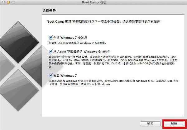 第七步:在电脑重启后就开始正式安装win7了(有些版本的苹果笔记本在安装的时候会直接进入苹果系统,此时我们在开机时要长按option键,在出现mac系统和windows系统时,我们选择windows系统,这样才会继续安装,这时还会有U盘的标志,一定不要选错了哈)。我们看到图上有个BOOTCAMP的分区,这就是我们要选择安装的windows系统了,千万不要选错了哈。当然如果你想多分几个区的话,我们可以先删除此分区,再重新分几个区,但是在选择分区的时候不要选择安装到苹果分区啊,否则就不是双系统了,就是一个win7的苹果机了。