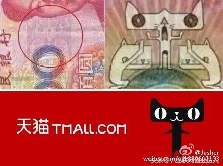 天猫logo和马云对比 在天猫LOGO发布后的两个月,有细心网友发现了一个惊人的秘密:天猫的LOGO图案竟然藏在100元人民币里。这是巧合呢?还是有意为之?人民币为何会有10个“膜拜猫”呢?