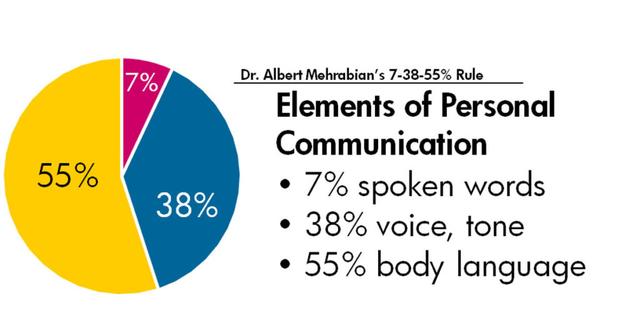 根据雅伯特·马伯蓝比(Albert Mebrabian)教授研究出的「7/38/55」定律:从沟通的效果层面来看,肢体语言所起的作用最大,占到55%,语音语调38%次之,而沟通的内容其实只占到7%。肢体语言和语音语调可以被统称为信息的传达方式。