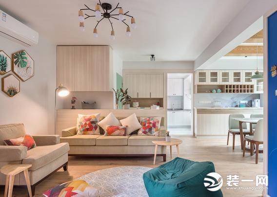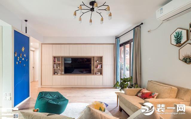 从门厅步入客厅,充满绚丽色彩的空间传达着这对年轻夫妻的热情,富有无限活力的氛围搭配不乏北欧小清新的干净和明朗,以及令人忍不住想亲近的木调作修饰,淡蓝色调是空间里最美好的调色板,一股清凉,一种不俗的生活
