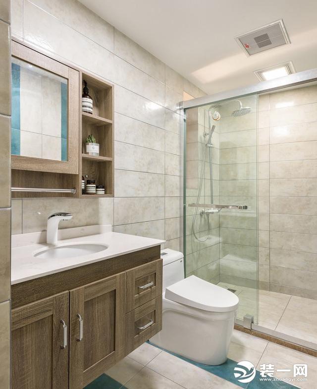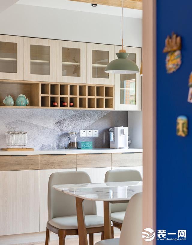 深蓝色成了主卧里配色的主角,搭配棕木色调的背景墙,安心舒适。墙上风格迥异的抽象画,色彩上的对比又给了视觉上的冲击感,令整个空间弥漫着丝丝艺术气息。 卫生间是我们功能最强大的一个空间,也是用水量最多的一个地方,所以防水是第一要位!一定要找个专业的团队做最专业的防水,卫生间的五金小配件也很多,我们买的时候也要买质量好的。很多时候家里出现问题都是这些小配件引起的,更换起来也很麻烦。 卫生间里的玻璃隔断很好的起到了干湿分离的作用,蓝色的地板与空间形成鲜明对比,活跃了空间明亮度,显得很好看 很多人家的餐厅都是不大的,所以能够容纳的就是餐桌和椅子,如果可以放上一个酒柜也是不错的选择。餐桌的大小和椅子的数量要根据家里的成员进行选择,做好就是能够多出来2人位置,这样在来客人的时候也不会因为没有椅子,而发生尴尬的事情。