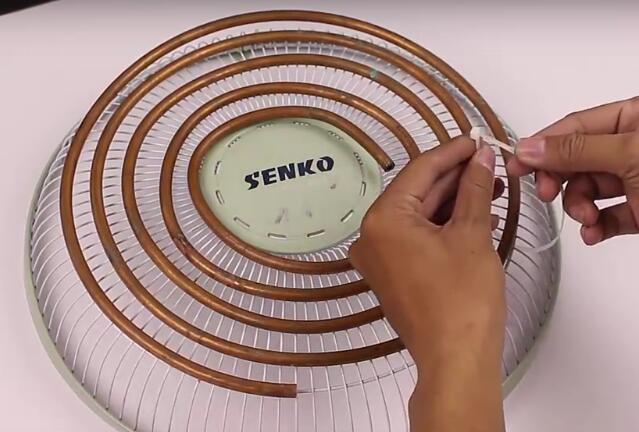 在把电风扇的外圈直接拆下来之后,我们就需要把卷好的铜线圈给固定在电风扇的外圈上面了,用这个绳子直接在他们的四个角上全部固定住。