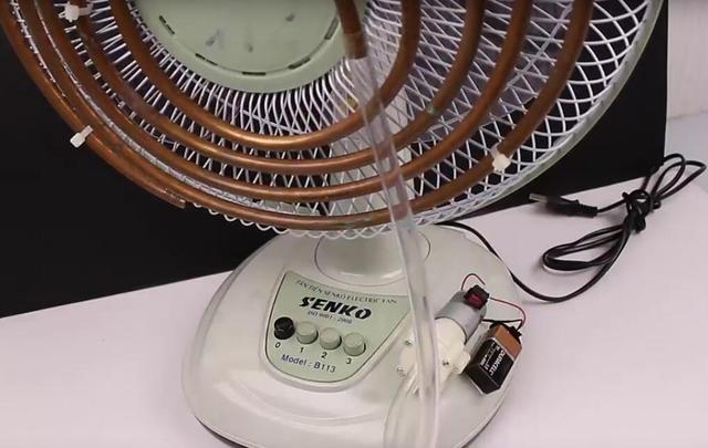最后的成果就是这样子了,在我们准备好的这个泡沫箱里面放入冰块和水就可以了。然后我们可以看到在开关打开之后,这个冰水就会通过水管最后流进铜圈里面循环,之后我们电风扇吹出来的就完全是已经制冷好的冷风了,这个效果是和空调的差不太多的,看上去是不是非常的凉爽呢。 |