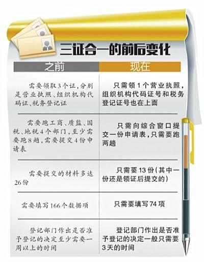 三证合一指的是哪三证? “三证合一”登记制度是指企业登记时依次申请,分别由工商行政管理部门核发工商营业执照、组织机构代码管理部门核发组织机构代码证、税务部门核发税务登记证,改为一次申请、合并核发一个营业执照的登记制度。 3月20日,中共中央政治局常委、国务院总理李克强来到国家工商行政管理总局考察并主持召开座谈会。李克强强调,工商部门是政府和市场的重要联接点。要抓紧推进“三证合一”等改革,年内力争实现“一证一号”,切实降低企业注册场所要求,继续简化企业登记和注销流程。依托大数据完善监管平台,探索建立统一监管机制,加快推进综合执法,坚决防止弹性执法、选择性执法,提升执法公信力。这对政府是自我革命,要从全局出发“忍痛”前行,也是打掉寻租空间。各部门都要主动谋划,形成合力,把进一步激发市场活力的改革“好菜”、“新菜”端出来,共同营造便民利企的良好环境。 根据国务院2014年20号文件的要求和国家工商总局的部署,江苏等多个地方从去年年底开始试行工商营业执照、组织机构代码证和税务登记证“三证合一”登记制度改革。记者在江苏探访发现,改革仅仅试行了半个月,其带来的便利已经得到了老百姓的认可。根据国家工商总局的部署,今年将在全国范围全面推开“三证合一”,并开展“一照一号”试点。 2014年,国务院发布的20号文件中要求,由工商总局、中央编办牵头负责,简化手续,缩短时限,鼓励探索实行工商营业执照、组织机构代码证和税务登记证“三证合一”登记制度。这是“三证合一”首次进入公众视线。 去年年底召开的全国工商行政管理工作会议上,“三证合一”成为工商部门2015年的一项重要工作。国家工商总局局长张茅表示,2015年将在“三证统发”的基础上,全面推开“一照三号(即三证合一)”,积极开展“一照一号”试点,最大限度降低社会成本和行政成本。 对此,中国人民大学商法研究所所长、民商法博士刘俊海教授指出,“三证合一”方便企业,能降低交易成本,提高交易透明度,鼓励投资兴业,是“健全社会诚信的一项好制度”。 “三证合一”最终目标是实行“一照一号”模式,通过“一口受理、并联审批、信息共享、结果互认”,将由三个部门分别核发不同证照,改为由一个部门核发加载法人和其他组织统一社会信用代码的营业执照。 |