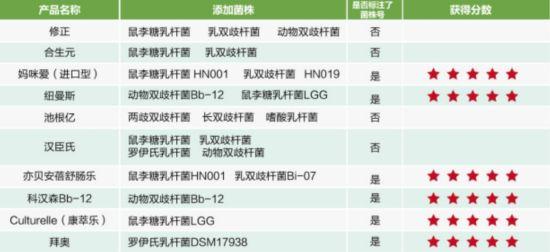 通过卫生部颁布的名单可以看出,只有以上9株益生菌可以用于婴幼儿食品。如果益生菌未标注菌株号,仅仅标注了菌株,则不能说明其可以适用于婴幼儿。比如乳双歧杆菌有很多种菌株,而只有HN019和Bi-07可以用于婴幼儿食品,其他则不能。所以未标注菌株号的益生菌给婴幼儿服用是有风险的。因此,在这一环节,没有标注菌株号的益生菌不能得分(安全性不能确定,实在是不能给分)。而标注了菌株号,而且在卫生部规定名单内的得5颗星。