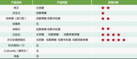 三、是否添加了益生元 所谓“益生元”是一类可以促进益生菌增殖的低聚糖的总称,也被称之为益生菌的食物。很多食物中都含有益生元,比如蔬菜、水果等等。所以,在补充益生菌的同时增加益生元,一方面可以补充益生菌,一方面还可以增殖益生菌。这样就可以起到更好的效果。益生元的种类很多,目前公认增殖益生菌效果最好的是水苏糖。因此,在这一环节,添加水苏糖的得分2颗星,而其他每添加一种低聚糖得分1颗星,没有添加益生元的则没有得分。