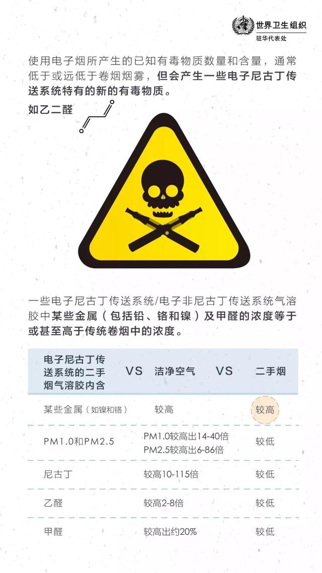 不知从什么时候开始,身边突然多了一群电子烟爱好者: 同样是抽烟,他们能毫无心理负担地在室内吞云吐雾;明明有烟味,他们却说这是混合着水果味的烟草香气…… 很多电子烟的使用者,并不把自己当做「烟民」,而更喜欢被称为「玩家」。 「烟民」能摇身一变成为「玩家」,电子烟带来的影响也像他们鼓吹的那样“无害”吗? 《生命时报》结合世卫组织的最新提醒,告诉你电子烟的烟雾里到底有什么。 电子烟部分甲醛超标今年央视3•15晚会就对电子烟进行了点名,记者从市场上随机购买了八种电子烟烟液,送到一家通过美国约翰.霍普金斯大学和全球控烟研究所认证的实验室。 检测发现,一部分烟液尼古丁浓度值标识不规范,60毫升的烟液,标注含量6毫克,只有含量数值没有表达单位,极易误导消费者。