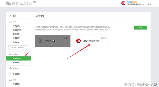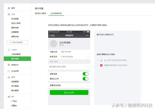 在小程序管理中,也多了一个小程序。 等待审核通过,就可以点击小程序 进行商品管理了。 最后在展示场景中显示展示在附近和公众号资料页即可。