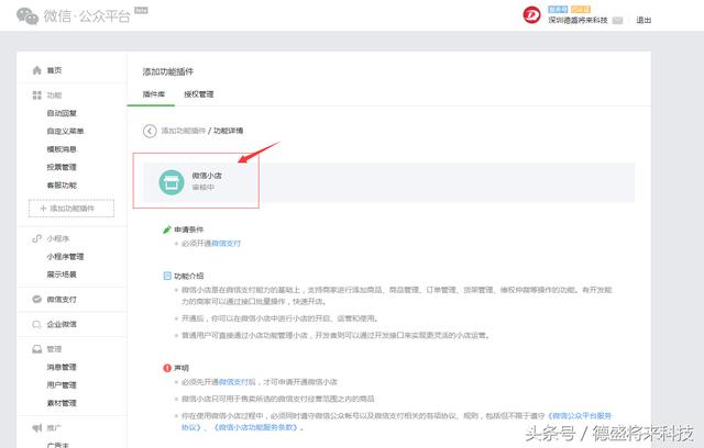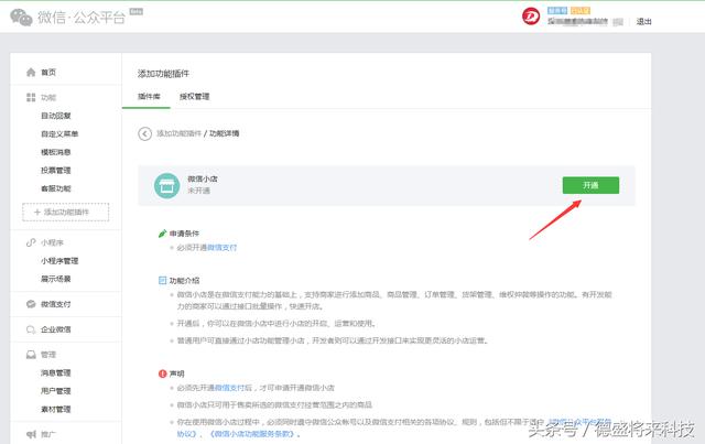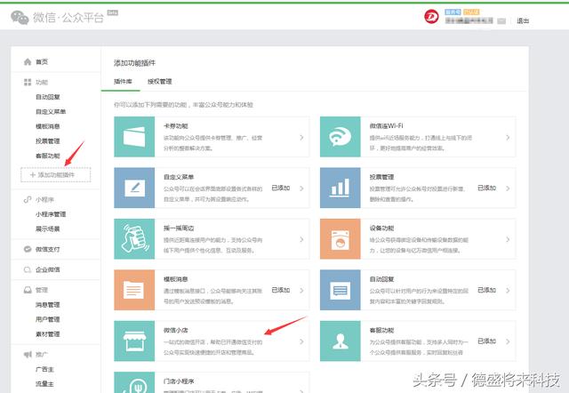 话不多说,直接上教程(需要认证服务号并且开通了微信支付,如果没有请先认证服务号,再开通微信支付) 话不多说,直接上教程(需要认证服务号并且开通了微信支付,如果没有请先认证服务号,再开通微信支付) 登陆微信公众号后台 选择【添加功能插件】- 选择【门店小程序】