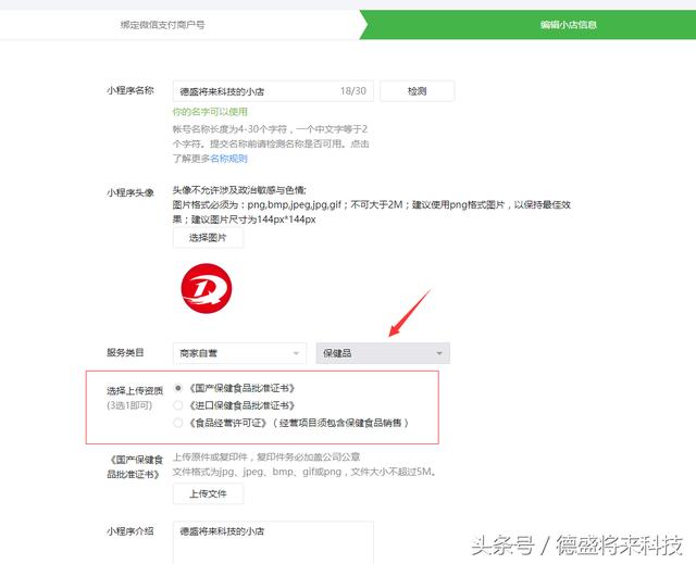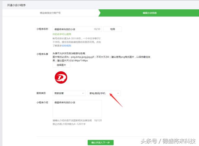 输入微信小店小程序的名字, 它会显示在顶部标题处 需要注意的是服务类目 根据自己的行业选择对应的项目 不同的行业需要上传不同的资质 (很多审核通不过原因就在这里) 最简单的就是数码3C这个类目 不需要提供额外资质