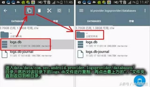 3.成功Root后,请在手机上安装并打开“RE管理器rootexplorer”(可在您平时下载app的任意应用市场上进行搜索下载),进入到“data/data/com.sec.android.provider.logsprovider/databases/”目录,然后对该目录下的logs.db文件进行复制,复制后请点击“..”图标返回上层文件夹,直到返回到根目录。 说明:如果找不到logs.db文件或前面所说的目录的话,请跳过这一步,直接看下一步。