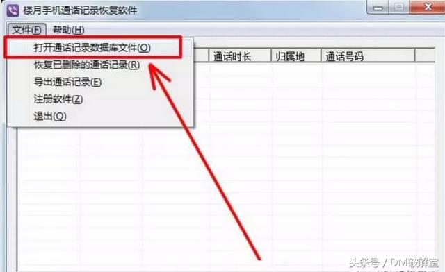 5.在电脑上下载并打开“楼月手机通话记录恢复软件”,点击下图箭头所示的“文件”,“打开手机通话记录数据库文件”菜单,然后选中前面步骤中导出到电脑硬盘上的CallHistory.storedata文件。