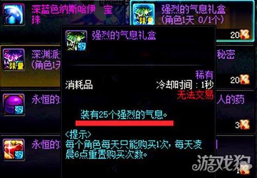 四、购买 在魔界营地还有中央公园里的乔纳森NPC处可以选择购买,一袋礼袋有25个强烈的气息,一天最多可以买四个,也就是最多可以获得100个强烈的气息,一个礼袋价格10个精炼时空石。 五、巨龙副本 这里的出货率还是比较高的,建议大家直接刷2图,2图相对来说比较简单,是最节省时间的地图,如果没有黑钻的话大概一条疲劳能获得130个左右,开黑钻大概在160个左右。 六、虚妄迷宫副本 每周二、五和周日开放,通关可以获得2个强烈气息礼盒,有点是不费疲劳。 |