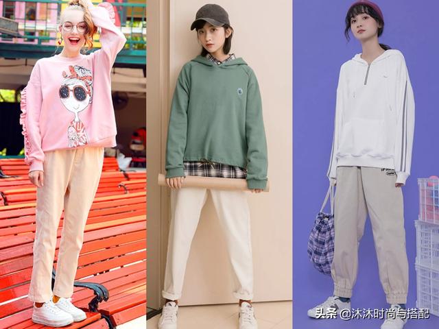 3、卫衣+休闲裤 这个卫衣+休闲裤的组合,比较舒适时尚,很适合腿粗的女生,因为裤子都是哈伦的设计,所以轻松遮掩腿部多余的赘肉,视觉上十分显瘦的,搭配卫衣会让人觉得更休闲,更舒适。