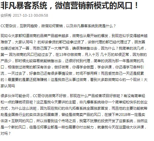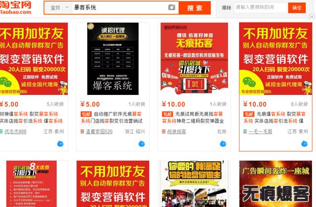 从上图可以看出淘宝推广的还不多,也正证明这个项目还有很多推广空间!暴客系统是利用微信的群发功能给所有好友进行信息群发!淘宝上卖相关软件的很多!知道原理,会使用就行。提前配置好广告内容,手机端扫码后就可以将广告信息全自动推送到对方通讯录好友!不需要加好友,只需扫一扫,即可自动群发,不绑定微信号,0 风险封号。 2.暴客系统的优势和危机 存在即必然,既然暴客系统热传,肯定是适应了市场,满足了一部人的市场需求。绝对客量倍增10-100倍!每个行业都可以使用!你的产品和活动可以对着十万人销售,秒杀目前市场上所有的一切微信营销软件和方法。将要代替传统发单页的活动!省去人工成本!省去大量时间成本!不受地域限制!将您的广告一变百,百变万,万变百万 ,横扫全城!无限次传播!