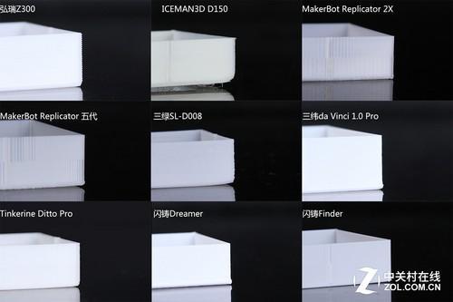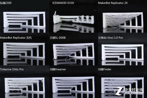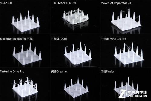 随着我国3D 打印行业的不断 发展,桌面级3D 打印机的机型也 层出不群, 西通,弘瑞,太尔时代,闪铸等3D打印机知名厂家 不断推陈出新, 3D打印研发技术更是 精益求精,生产了 大量高性能 高精度的桌面级3D 打印机,今天弘瑞小编从9款3D打印机打印的模型评判国产3D打印机那个牌子比较好! 成型质量 细节分辨率对比细节分辨率测试,测验3D打印机对模型突出的细节塑造能力。考察能否形成棱柱、能够打印出棱柱尖端、是否能够还原四棱柱形状且没有形变、缺损,是否干净无拉丝。这里打印效果最好的是闪铸Dreamer,干净无拉丝,并且尖端形状还原比较准确。拉丝的情况在弘瑞Z300、MakerBot Replicator 2X、三纬da Vinci 1.0 Pro和Tinkerine Ditto Pro上都存在;弘瑞Z300的棱柱尖端成型质量比较好。