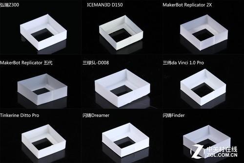 X/Y轴一致性测试效果对比在看X/Y衔接处,也就是正方体侧面的拐角。弘瑞Z300、MakerBot Replicator五代、闪铸的两款机型都有着比较平顺的边缘,每一层在衔接处都能比较准确地实现X/Y步进电机切换。与之相对比,三纬da Vinci 1.0 Pro略微偶不规则的边缘层出现。三绿SL-D008的衔接处比较毛糙,Tinkerine Ditto Pro也出现了一些这种状况。