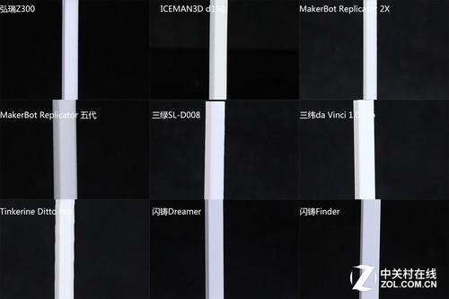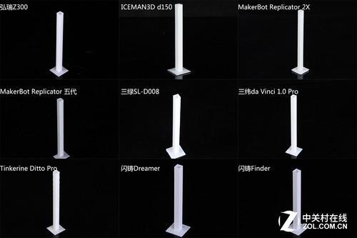 Z轴稳定性打印测试直立细棱柱仔细看立柱的细节,立面都比较光滑,其中弘瑞Z300、MakerBot两款机型、闪铸两款机型的打印效果,接近完美。ICEMAN3D D150打印棱柱的效果则一改前两项测试中表现的缺陷,打印出比较光滑直立的侧壁。