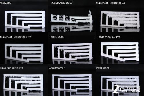 正面观察跨桥打印效果对比MakerBot Replicator五代可见少量下垂的悬丝,与闪铸Dreamer的下垂悬丝量相近。Tinkerine Ditto Pro和三绿SL-D008相近,从最下方短桥开始就出现悬丝,到上方最长桥则有了比较多的悬丝,并且侧面立柱有少许拉丝;闪铸Finder则是有比较多的下垂悬丝,MakerBot Replicator 2X的悬丝更多一些,有一小部分没有完成跨桥动作,垂到了桌面上。从正反两方面对比中,我们能够更清楚地看到这一现象。