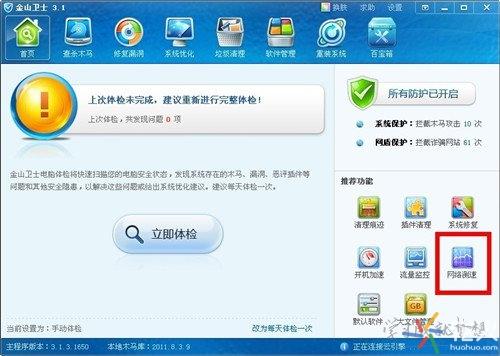 有很多网友在玩游戏时候突然卡住了,上网看视频时候打不开网页等现象,那么你知道怎么让电脑网速变快么?接下来是小编为大家收集的怎么让电脑网速变快,欢迎大家阅读: 怎么让电脑网速变快 1.首先了解你当前网络环境是什么样子的,打开金山卫士主界面,运行“网络测速”,金山卫士会以精准的数字计算,并将当前的网络情况为您推荐您适合哪些当前网络应用,如 在线电影、网络游戏等。