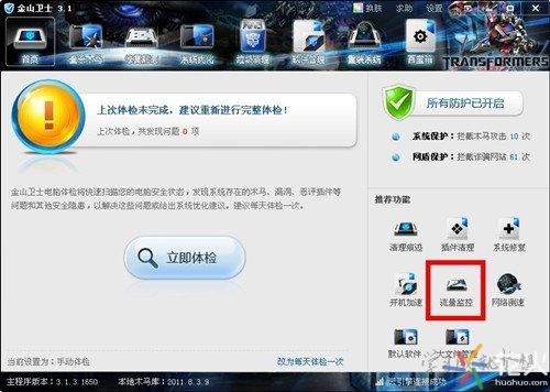 2.如果你发现网速是在突然情况下变慢了,建议你通过流量监控查看是否有进程占用大量的网络带宽(例如你在使用p2p软件,如迅雷 qq旋风等),然后对其该进程进行限速。打开金山卫士主界面,进入“流量监控”功能,找到占用流量比较大的程序进行流量限制。