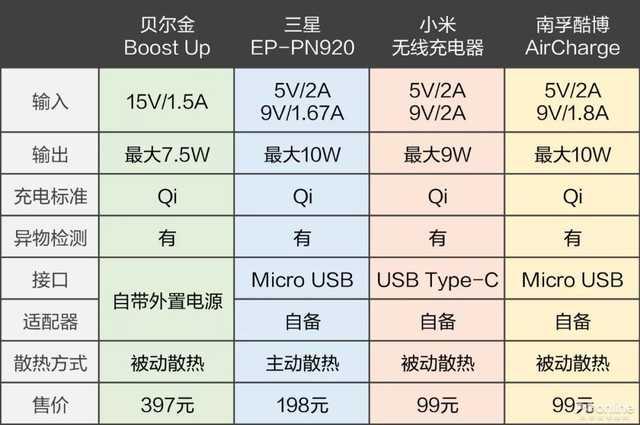 4款无线充电器的参数如下表所示:
