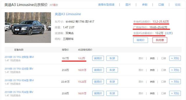 作为宝马1系的直接竞争对手,奥迪A3比宝马1系三厢还要早出来那么几年,因此目前它的优惠也比1系要更大,终端优惠达到了将近7万元左右,真是非常高的了。所以,15万元买一台低配版的奥迪A3那绝对是不成问题的,而且值得一提的是,低配版的奥迪A3在配置方面也几乎没有缩水,就拿乞丐版来说,倒车雷达、真皮方向盘、中控屏、胎压监测以及各种安全配置它都有,所以说奥迪A3这车是上手即开,也完全不会丢面子。此外,奥迪也还提供丰富的选装,像什么倒车影像、定速巡航、自动泊车入位、自动空调、前排座椅加热、电动天窗等等实用功能它都是能选装的,因此配置上真的可以的。不过缺点也同样有,那就是后排空间实在太小了,2629mm的轴距和同价位的B级车相比确实不够看,后排坐个1米8的大个的话那感受也是憋得慌,因此有大个的慎买。至于网上很多人说它是换标高尔夫,个人觉得首先品牌上就不同,试问一个大众标能有奥迪标值钱吗?再一个调校不同,虽说都是EA211的发动机和多连杆独立悬架,但是开起来的感受却是完全不同的,因此,换标高尔夫这一说法不可信。而且值得一提的是,新款A3还支持国六的排放标准,所以新款还是很值得入手的。
