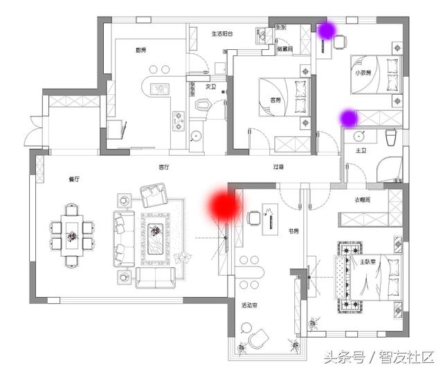 传输性能测试 旗舰路由器不是摆着看的:用性能说话才是硬道理,为了更直观体现极X的性能,我会用它与在用的某友商价格近千元旗舰无线路由器进行直接对比,为降低邻家无线可能形成的干扰,数据采样均在凌晨12点后进行。 其中红点为无线路由器摆放位置,两个蓝点分别为传输数据设备的摆放位置。 经过测试,极路由X在持续数据传输的稳定性方面有明显优势。