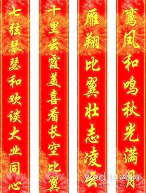 结婚的对联怎么挂二、新婚对联挂客厅 客厅是接待宾客重要的地方,按照传统婚礼来看,客厅更是新人成亲拜堂的地方,所以这里的结婚对联也是相当的重要。在客厅一般会选择两幅,一幅悬挂在墙面左右两侧,一幅挂在正厅,或者电视背景墙上。挂在客厅的对联讲究也比较高,从字来说,选择正楷、隶书或者行书,花纹图案与新婚有关。 上联:喜酒喜事喜逢喜日子 下联:新喜新人新开新家风 横批:喜结良缘 上联:不愿似鸳鸯嬉戏浅水 下联:有志象海燕搏击长风 横批:长长久久 上联:志同道合男女谐静好 下联:花俏月圆夫妻恩爱长 横批:心心相印
