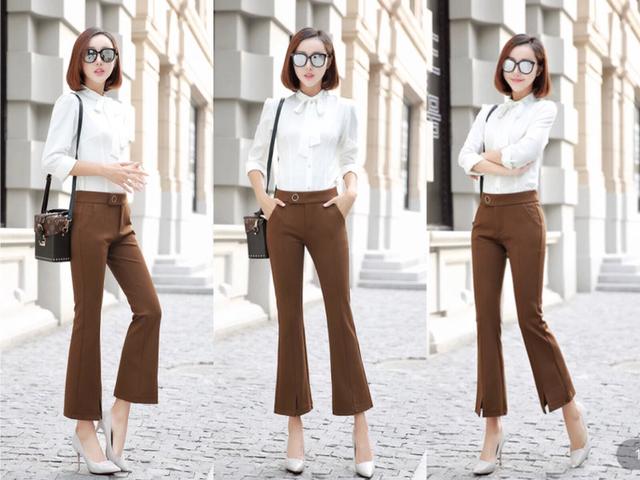 2018流行的九分喇叭裤,选这款黑色蕾丝九分喇叭裤来凹造型很不错的呢,自带着显瘦效果的黑色裤子,搭配喇叭裤型,上身显瘦又显高,九分的裤长,配上蕾丝的裤脚,还给人一种很浪漫的气息,特别美,上衣束腰搭配一字肩雪纺衫,性感又女人,一字肩配上松紧的设计,好穿好搭,并且还避免了脱落的尴尬,满满的设计感,领口下方还是荷叶边的点缀,显得更甜美了,和喇叭裤束腰的搭配,巧妙地把人的视线往上半身移动,却忽略下身的缺点,这样穿不仅好看还特显瘦。 搭配2:白衬衫+棕色九分喇叭裤