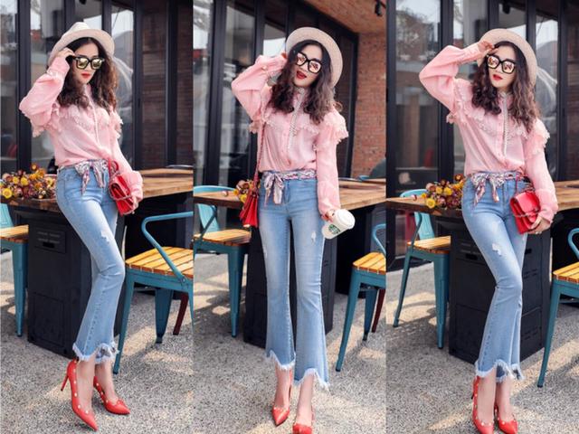 属于一款职场的穿搭,很干练利索的感觉,所以穿上都气场十足,上衣纯白色的衬衫,翻领的设计,彰显出职场成功女人的气质,下身搭配2018流行的九分喇叭裤,高腰,喇叭裤型,小开叉的设计,随意穿上都显瘦又好看,脚踏一双白色高跟鞋,整体造型更时髦显高。 搭配3:粉色衬衫+花瓣牛仔九分喇叭裤