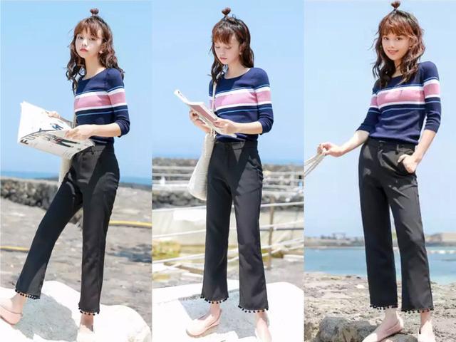 最百搭的一条裤子非黑色裤子莫属了,也是一年四季都可以穿的一款,那这款黑色九分喇叭裤,无论谁穿都能够达到显瘦的效果,宽松的喇叭裤型,还不挑腿型穿,九分的设计,可以轻松穿出大长腿来,裤脚是流苏的设计,增加了几分搭配上的看点,瞬间变时髦了不少,上衣搭配条纹T恤,轻薄的面料,初秋再适合不过的了,不仅舒适好看,还很时髦。 2018流行的九分喇叭裤,搭配对的上衣,不仅好看还特显瘦! 图片来自网络