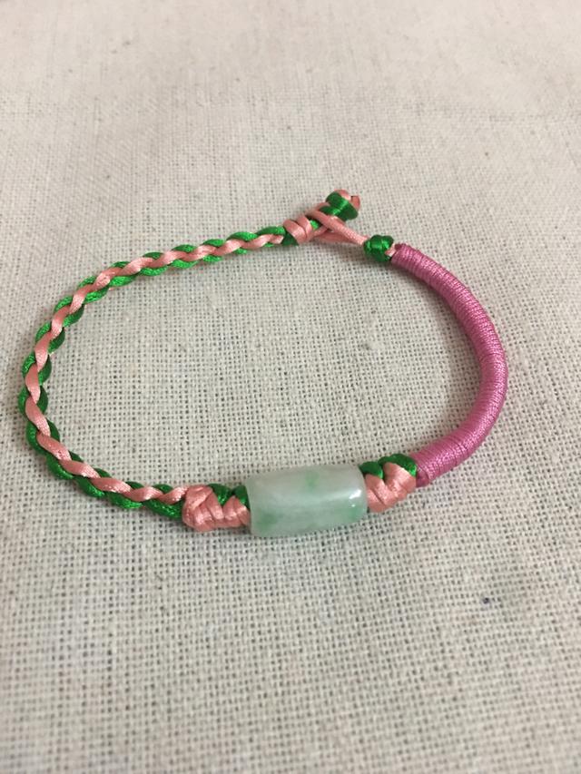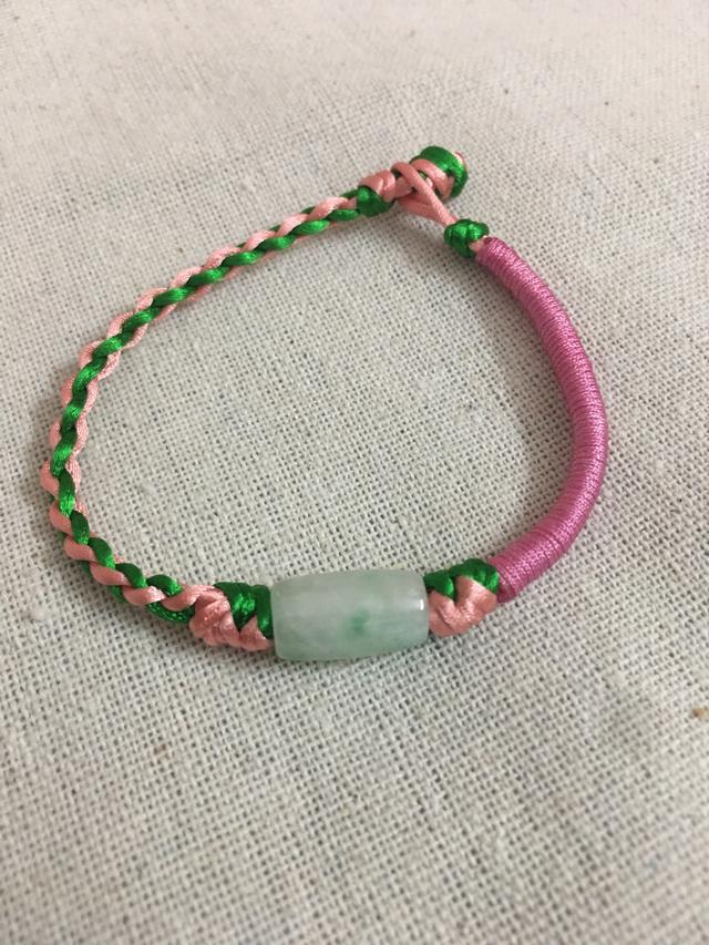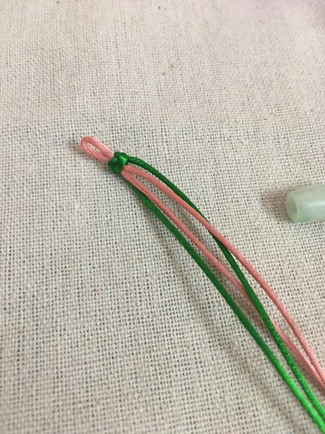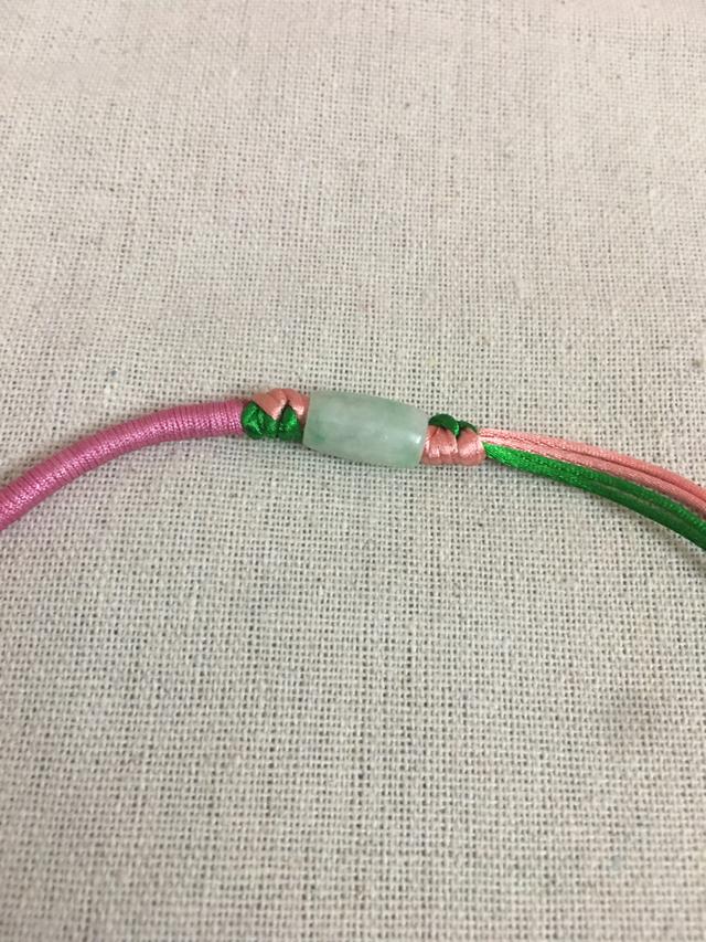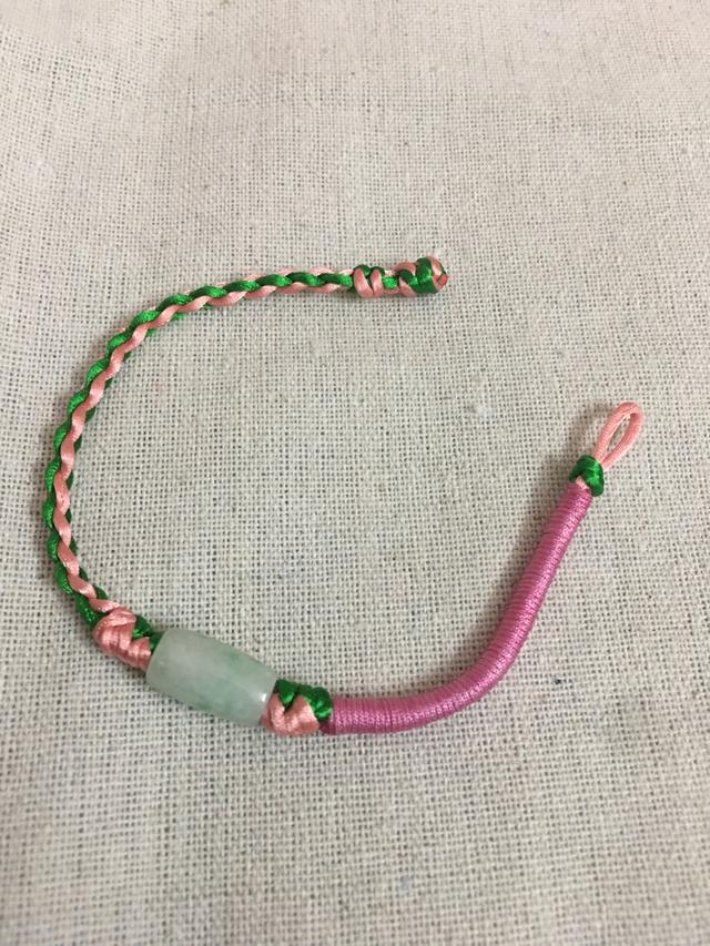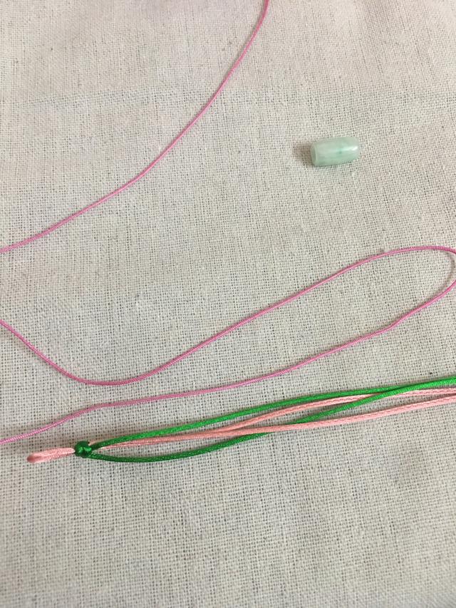 准备两条长度为80厘米的中国结线。一段长度60厘米的粉色72号玉线,当然还有一个翡翠路路通。