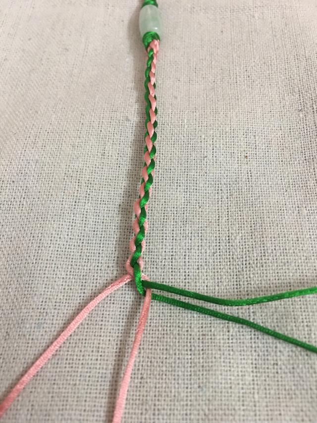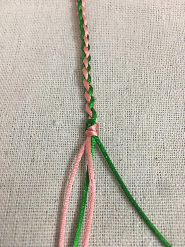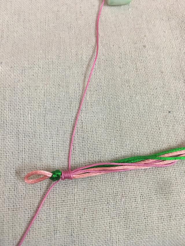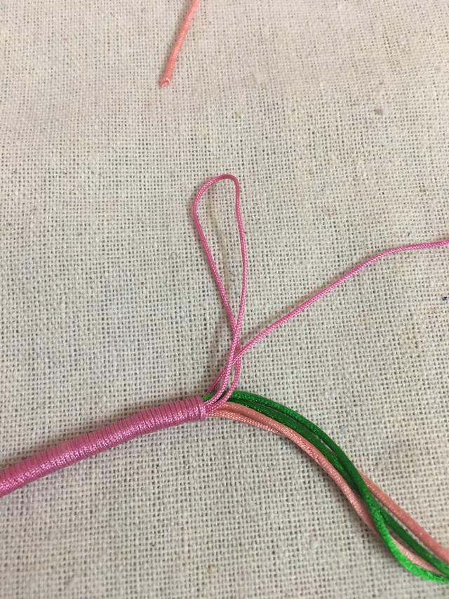 用粉色包住绿色线,编织两个包线金刚结。这样就可以把线地固定住,粉色线形成一个扣头。