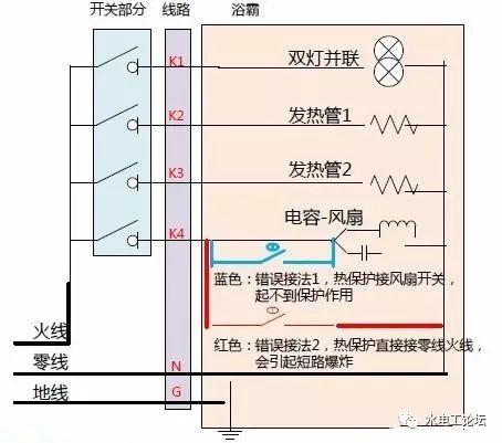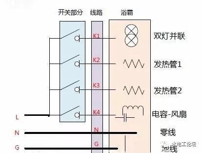 浴霸效果图 浴霸接线图详解 通常浴霸会有一个控制照明灯的开关,两个控制取暖的开关,如果仅从外面接线不能保证百分百接线正确,需要拆开它,再进行接线。如果接线错误,可能会烧线路,也可能一个开关打开后,照明模块,取暖模块,排风模块一起打开。 浴霸接线图
