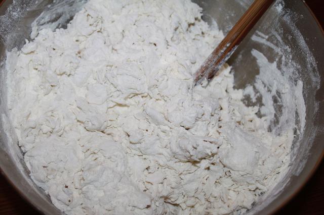 4.最后用手揉成一个整体。 5.不停的揉,直到面团表面光滑。盖上保鲜膜饧30分钟。 6.然后用劲揉面团,在饧10分钟。 7.饧10分钟后,再揉面团,揉的特别有劲道,再饧10分钟。 8.把饧好的面团拿出来,再揉,直到表面光滑